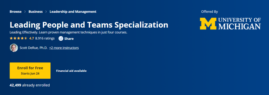Kurs hakkında daha detaylı bilgiye şuradan ulaşabilrsiniz: Leading People and Teams Specialization by University of Michigan