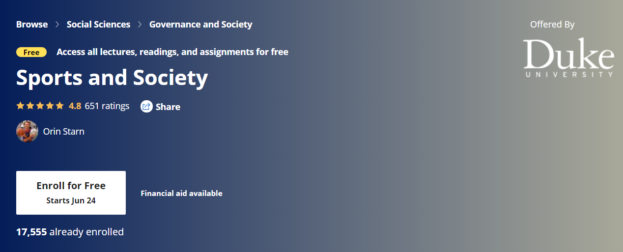 Kurs hakkında daha detaylı bilgiye şuradan ulaşabilirsiniz: Sports and Society by Duke University